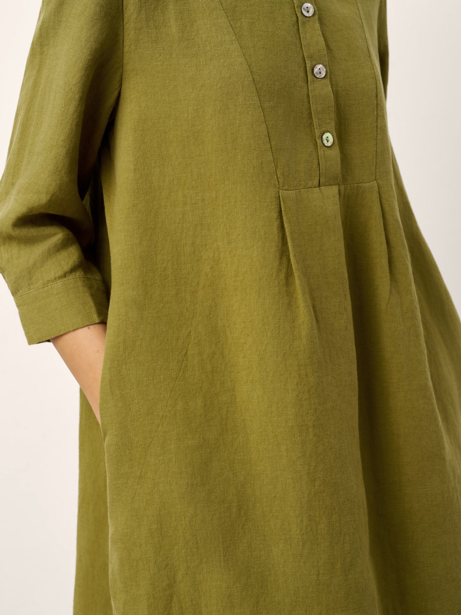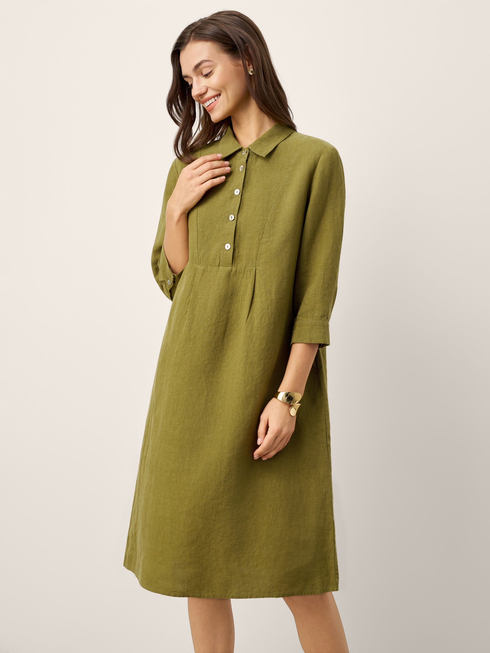 This linen midi dress blends natural texture with refined details: shell buttons and a crisp collar highlight the neckline, while front inverted pleats and back shirring create graceful, breathable movement.